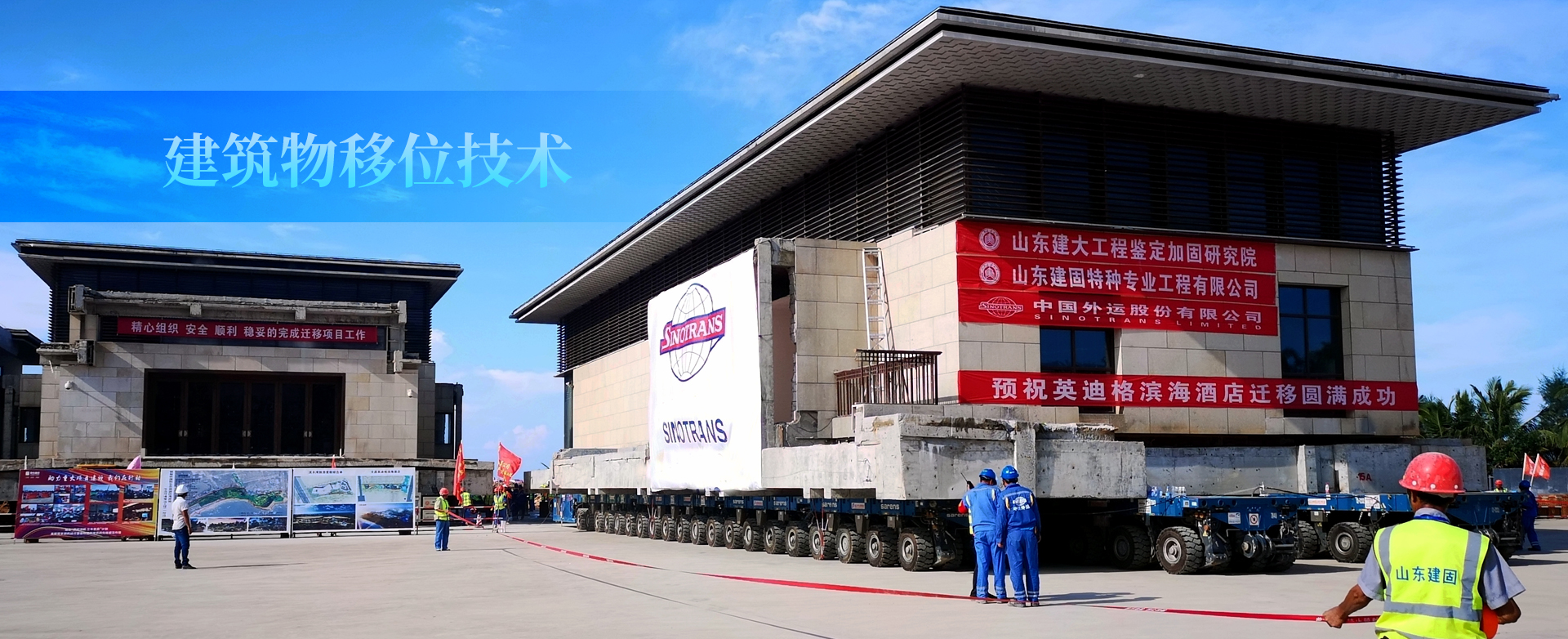 海南紅塘灣酒店為地下1層、地上2層鋼筋混凝土框架結(jié)構(gòu)。占地面積約2400㎡,總建筑面積4658㎡。遷移直線(xiàn)距離約500米,豎向頂升2.3米。紅塘灣酒店遷移工程的成功就位,標(biāo)志著一個(gè)新的記錄誕生:目前國(guó)內(nèi)外首例不規(guī)則扇形車(chē)輛布置、國(guó)內(nèi)拖車(chē)移位單體建筑面積最大(4658㎡)、國(guó)內(nèi)拖車(chē)移位單體建筑重量最重(7500噸)。山東建筑大學(xué)工程鑒定加固研究院、山東建固特種專(zhuān)業(yè)工程有限公司成立于1992年,三十年一直秉承“篤志疑難躬行求新”的企業(yè)精神,完成建筑物鑒定與加固改造、建筑移位、建筑糾傾項(xiàng)目六萬(wàn)余項(xiàng)。山東萊蕪高新區(qū)辦公樓平移項(xiàng)目,建筑面積24000㎡,重量35000噸,是國(guó)內(nèi)外最重平移工程;主持完成的