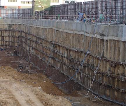 通過對各道工序的嚴(yán)格控制,基坑經(jīng)過1個多月的順利完工。基坑開挖過程中對每層的錨索施工過程按照規(guī)范和設(shè)計要求進行拉拔試驗,拉拔試驗結(jié)果表明每道錨索的承載力實際值與設(shè)計值比較接近,說明設(shè)計參數(shù)的取值比較合理。基坑開挖完畢后,基坑范圍內(nèi)所有觀測點,最大側(cè)向變形為13.3mm,大部分側(cè)向變形觀測點小于10mm,基坑周圍道路最大沉降為3mm,未見任何異?,F(xiàn)象,整個基坑所有觀測點的變形值趨于穩(wěn)定