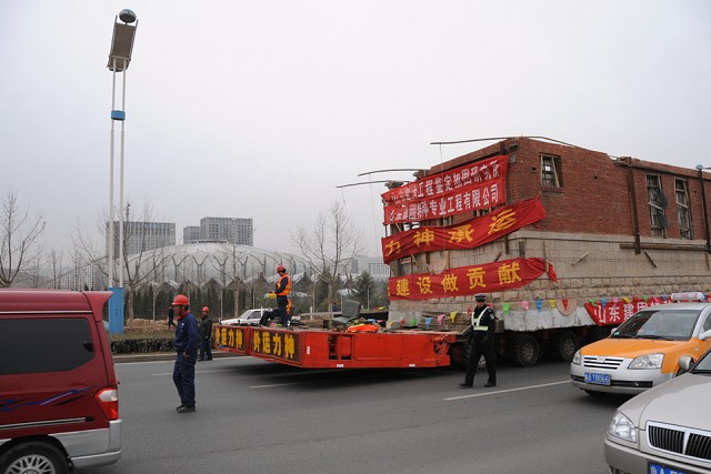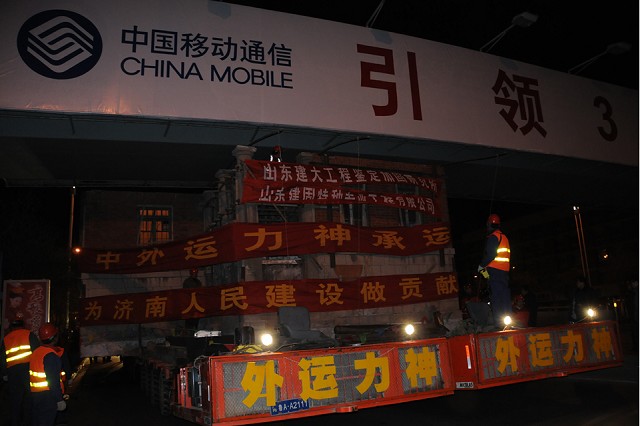 該建筑原位于繁華市區(qū),為了盡量減輕道路交通壓力, 對運輸線路進行了詳細勘察,遷移于3月1日21:38分開始,遷移過程中,老別墅四次屈身過街天橋,三過立交,于3月2日11:43安全到達山東建筑大學新校區(qū)。整個遷移過程歷時14小時,遷移距離為30公里。