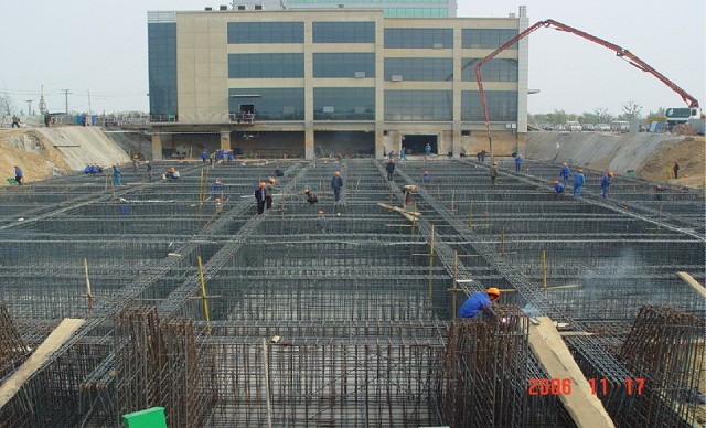 該建筑為框架—剪力墻結(jié)構(gòu),由主樓和裙樓兩部分組成,主樓地下1層,地上15層,裙樓地下1層,地上3層,長(zhǎng)72.8m,寬41.3m,占地面積2700m2,總建筑面積24000m2,總高度67.6m, 基礎(chǔ)采用筏板基礎(chǔ)。