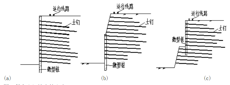 考慮到工程場(chǎng)地周邊條件(南側(cè)緊靠運(yùn)行線路)和地質(zhì)條件(上部填土較厚),考慮到工程對(duì)安全、工期和經(jīng)濟(jì)的要求,綜合考慮決定采用微型樁+土釘錨桿的復(fù)合土釘墻支護(hù)方案。這種形式的復(fù)合土釘墻有三種類型,不同工程技術(shù)人員對(duì)不同方案表達(dá)了支持意見(jiàn),現(xiàn)分述如下: